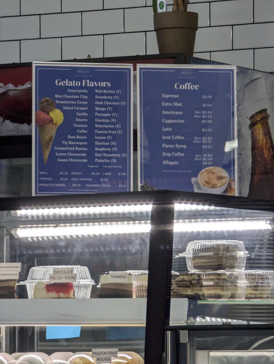 Overall, Briellies Gelato & Cafe offers a diverse and indulgent menu that leans heavily into sweet treats and refreshing beverages, making it a great spot for dessert lovers. The cake selection, including Chocolate Trilogy Round, Tres Leches, and Biscoff Salted Caramel Cheesecake, stands out for its richness, while options like Pistachio Ricotta Cake Slices and Dubai Chocolate Pistachio Cheesecake add a unique twist. Lighter choices such as the Large Fruit Salad and Small Plain Fruit Salad provide a refreshing balance. The drink menu is simple yet satisfying with staples like Coke, Red Bull, and Gatorade Fruit Punch, complemented by cozy options like Hot Chocolate 8 Oz and Tea 8 Oz, as well as treats like Affogato. Their gelato offerings, including the Gelato Cup, pair perfectly with specialty items like the Mangonada. Milkshake lovers can choose between Large Special Milkshake, Small Milkshake, and more, while pastries like Puff Pastry Nutella and Pain Au Chocolat round out the experience. With fun extras such as Tamarindo Sticks and Wafer Cookie, plus refreshing picks like Large Cholado and Small Snow Cone, the menu feels both varied and playful, even though pricing details are not clearly listed.